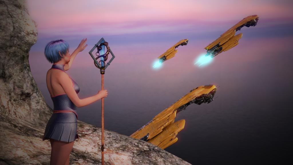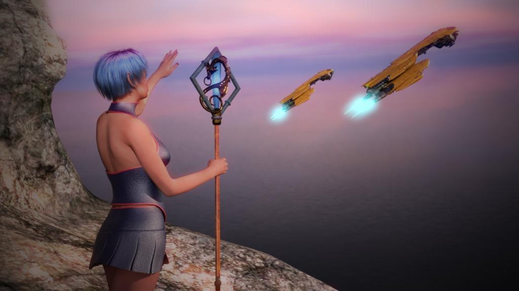 It's really a cool render. If I were to change anything I might delete the lower starship, but I'd have to then compare the two images. I think the girl is positioned very well.