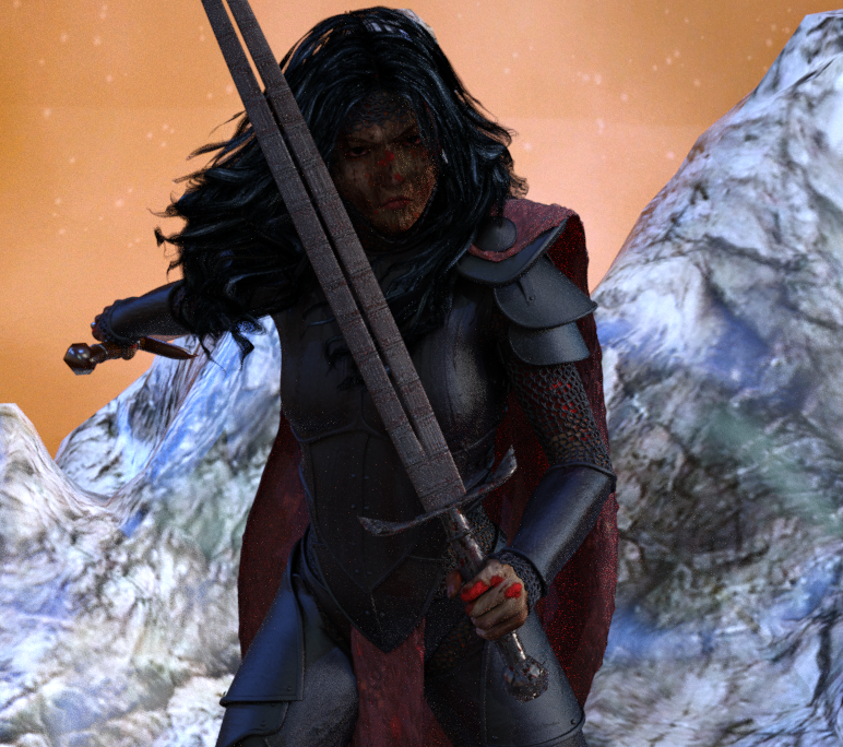 Considering switching out the indoor scene with the girl and the guy for this one. I spend more time on my laptop than I do on my pc and I'm not sure I will get the first one done in time (I know its only the 12th but trust me, I might not lol). I know I need to work on the lighting a bit to get her face to show more. and this is only rendered to 24%. And i am going to have to photoshop the top of the hair. There was no way to get the hair to fit under the chainmaille so I just covered it up and left the forhead more like a head piece than an actual cowl. May just photoshop the whole chainmaille hood since there is no option to just hide the hood. And to be honest, this is much more the type of art that I like to do lol. I will finish the other one with the suggestions given just because I need to learn how to do it and because I hate leaving things unfinished. Just not sure I can do it on the pc in time.