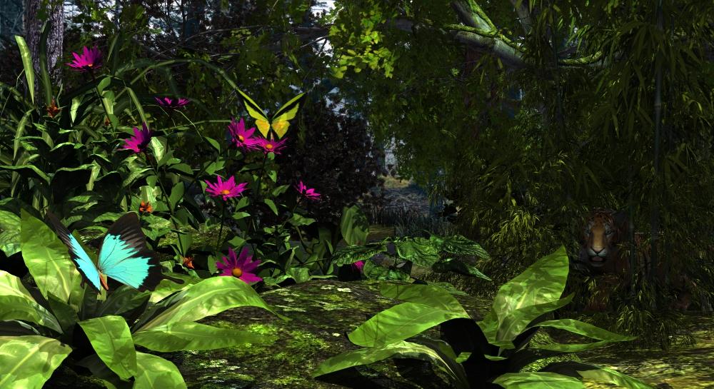I have worked with Uberenvironment before and it takes a much longer time to render than the Advanced lights.  This scene is so full that the viewport is slowing down, even with my powerhouse computer.  I wanted to see what I could do with advanced lighting.  As far as the position is concerned with the distance light, I'm wrestling not only with the butterflies but also have to keep the tiger from becoming too illuminated.  I still want the tiger's lower teeth so show but it was late last night and I was done.  I think I'll try the null, but not sure if I want to mess with it in this scene.  My final entry render will be larger.