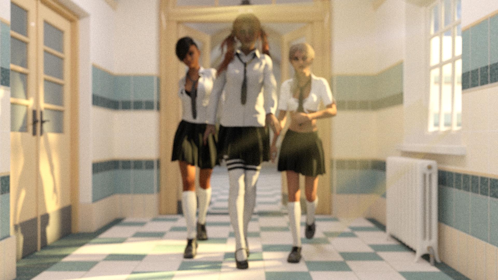 This is why it's not to recommend setting up scenes when tired. Yes, I have DOF on the camera. I moved the characters further back in the corridor for this render but forgot to adjust the DOF. Now when I checked, the focus point is far in front of the characters...