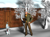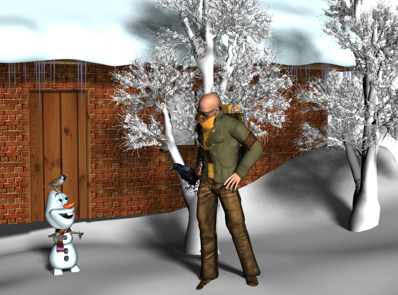 1) POSE.  The man is a little off balance.  Remember that the shoulder is always in line with the weight-bearing leg.  You need to fix the right foot because it is not on the ground.  To give the appearance that they are standing in snow, sink the feet and bottom of snowman into the snow a little.  Hands: Are His fingers supposed to be away from his body?  If not, you will need to adjust that.  Best advice for posing: Use yourself (or a willing friend) as a model.  Take a picture in front of a mirror - you will see how the weight is distributed on the feet.