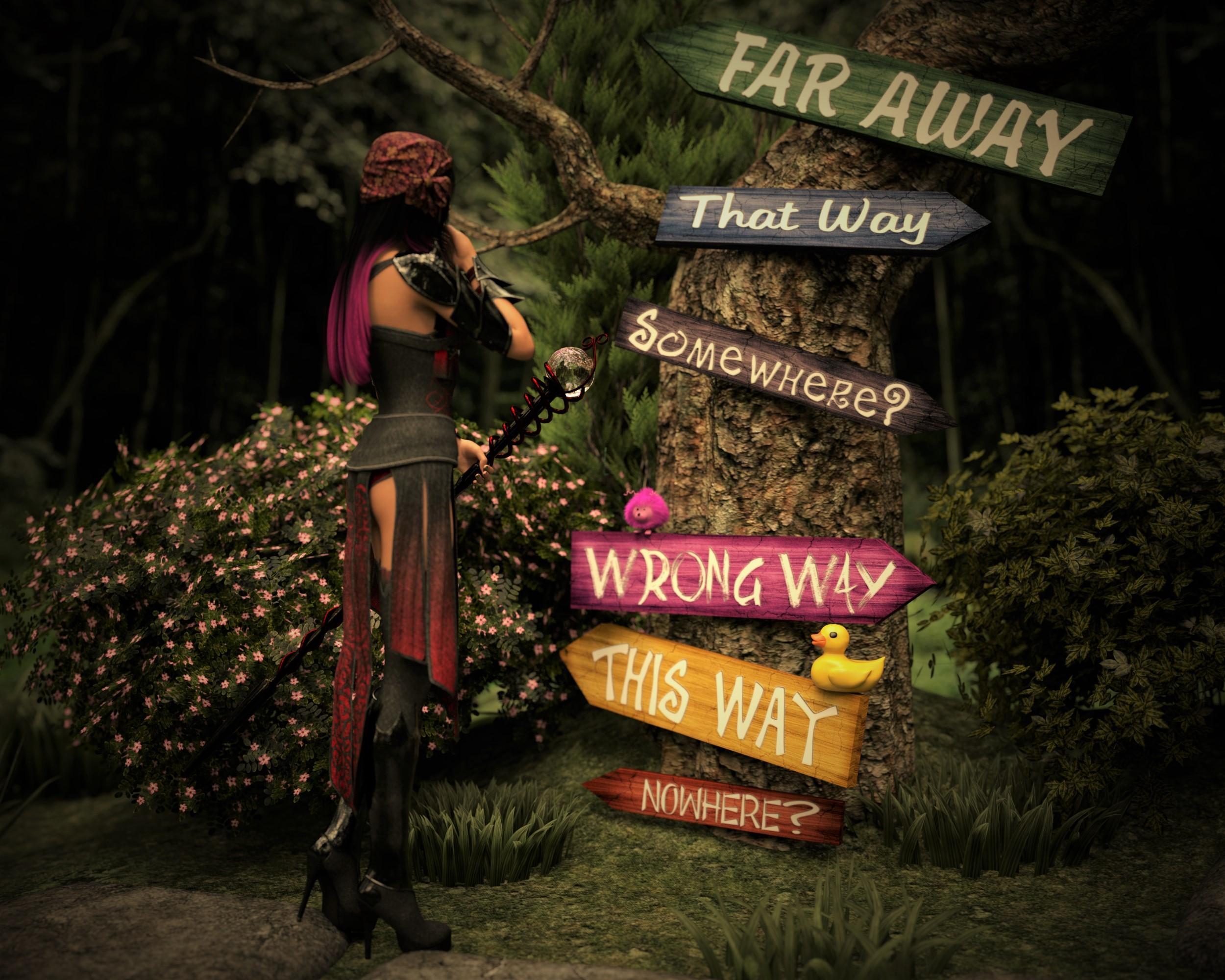 Kajiko is a bit lost and doesn't find this sign post particulary helpful. Pweek and Ducky both have their suggestions, but she doesn't think their advice can be relied upon at this time...
