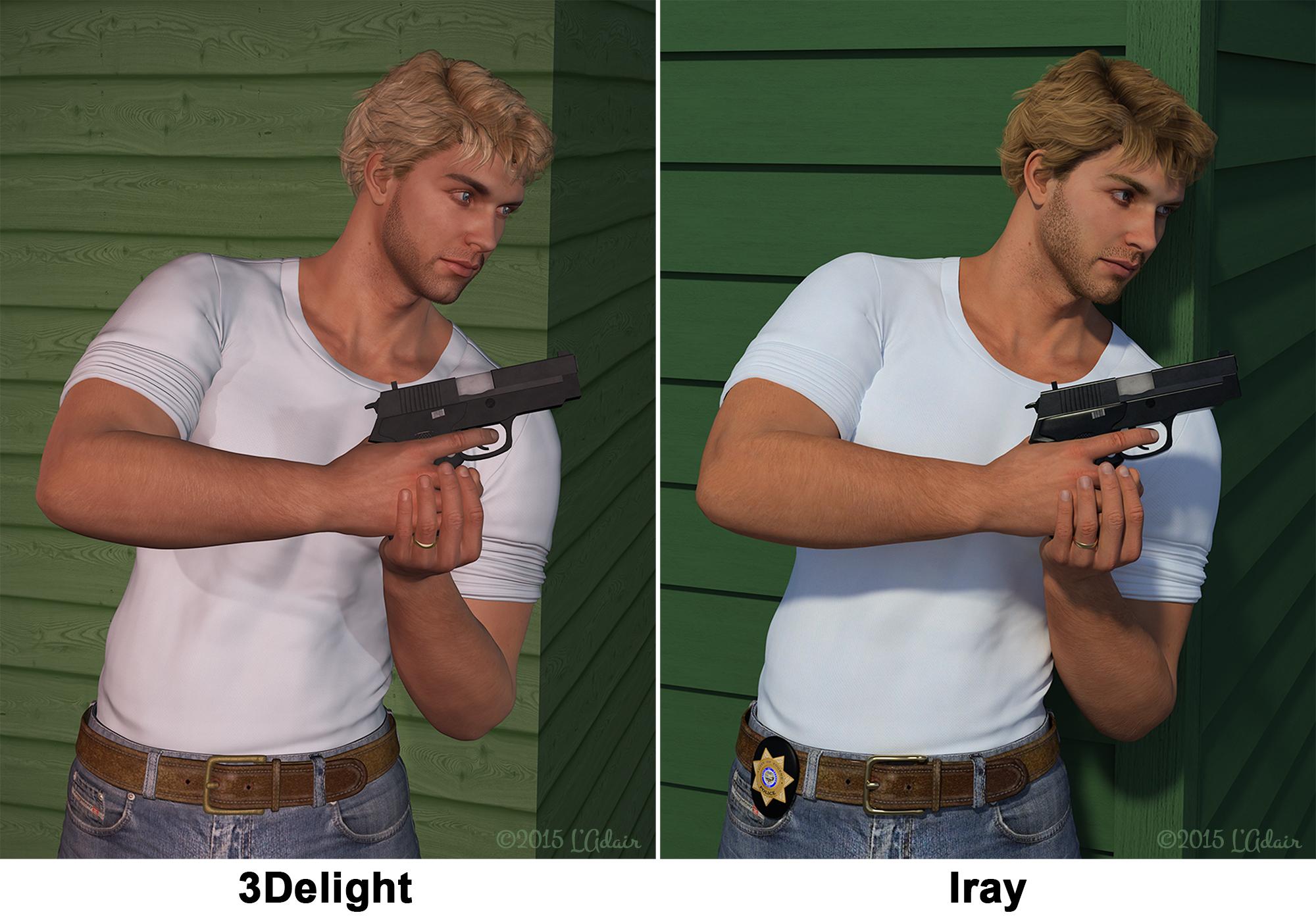 Side-by-side comparison of 3Delight and Iray render, by L'Adair