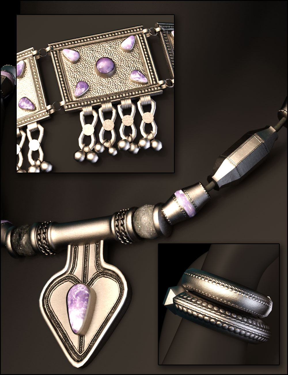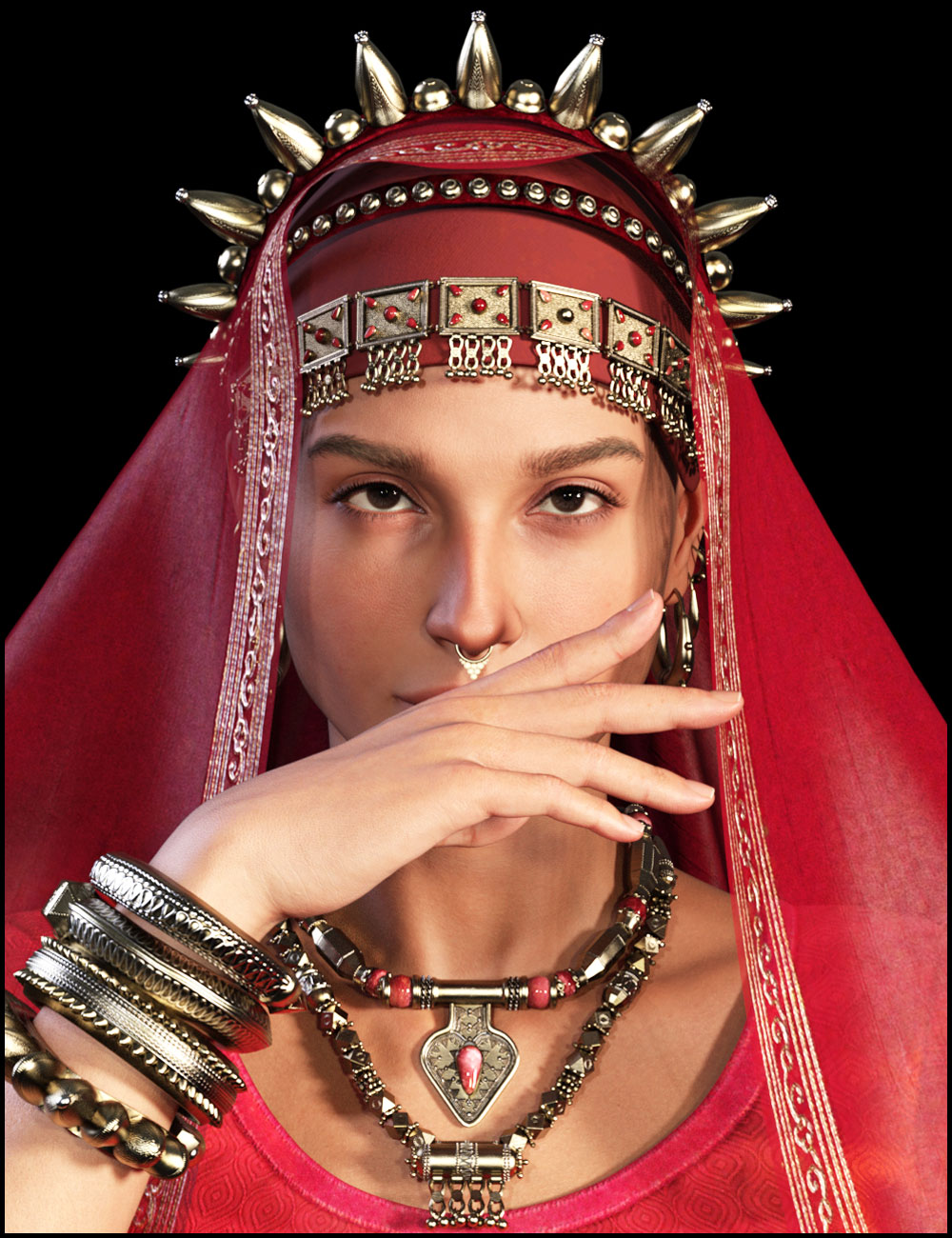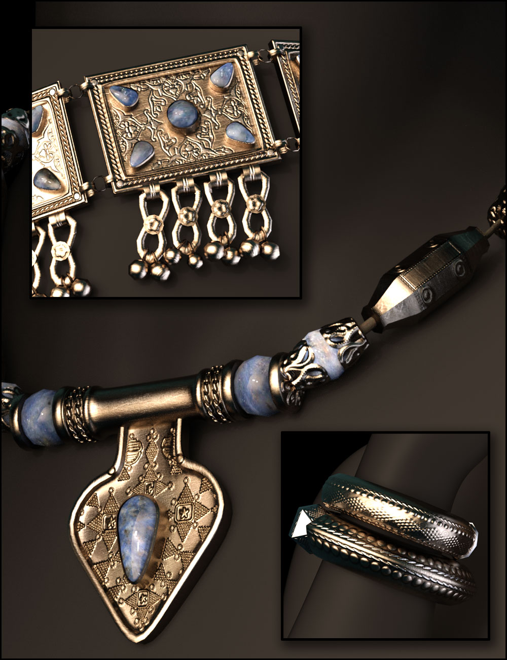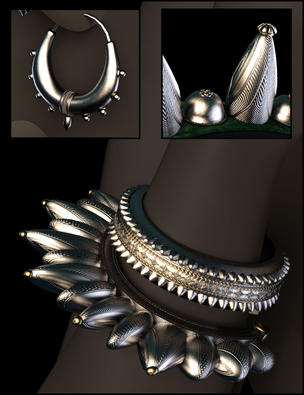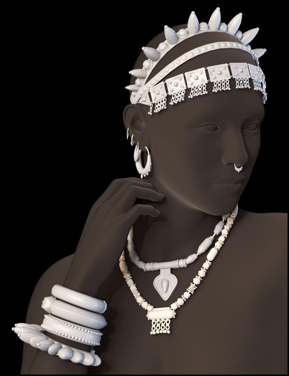 It was inspired by and then modelled from pieces in private collections and museum references, and includes four sets of highly detailed textures for those out of this world closeups. Quite a few of you guys know I dance as a hobby, and I hope my love for the heavy adornment we wear while dancing and the myriad cultures that live in the area comes across in the care I put in them.