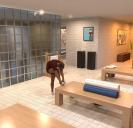 Moving the figure next to that bench he is using to place his foot on. That central piece had some rolled towels on it that I moved a bit back to make room for my figure to be able to pose his foot on the bench. It also had a pair os slippers right where I moved my figure to, so I moved these under the bench in the back.