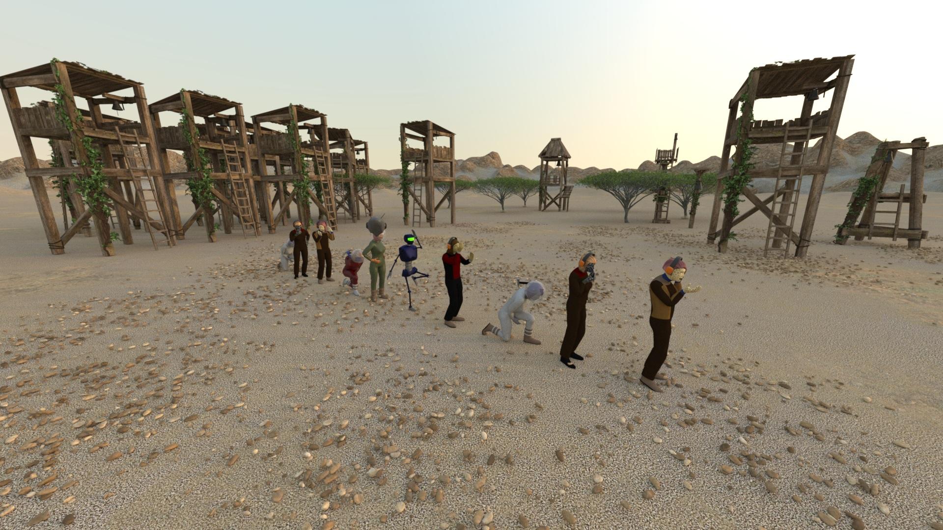 There are a lot of LowPi sitting in the outdoor cafe chairs. Richard Haseltine is even in the render, although he is not very many pixels. The dog is a billboard I made a long time ago. There is one waiter from the Dinner and a Show set.