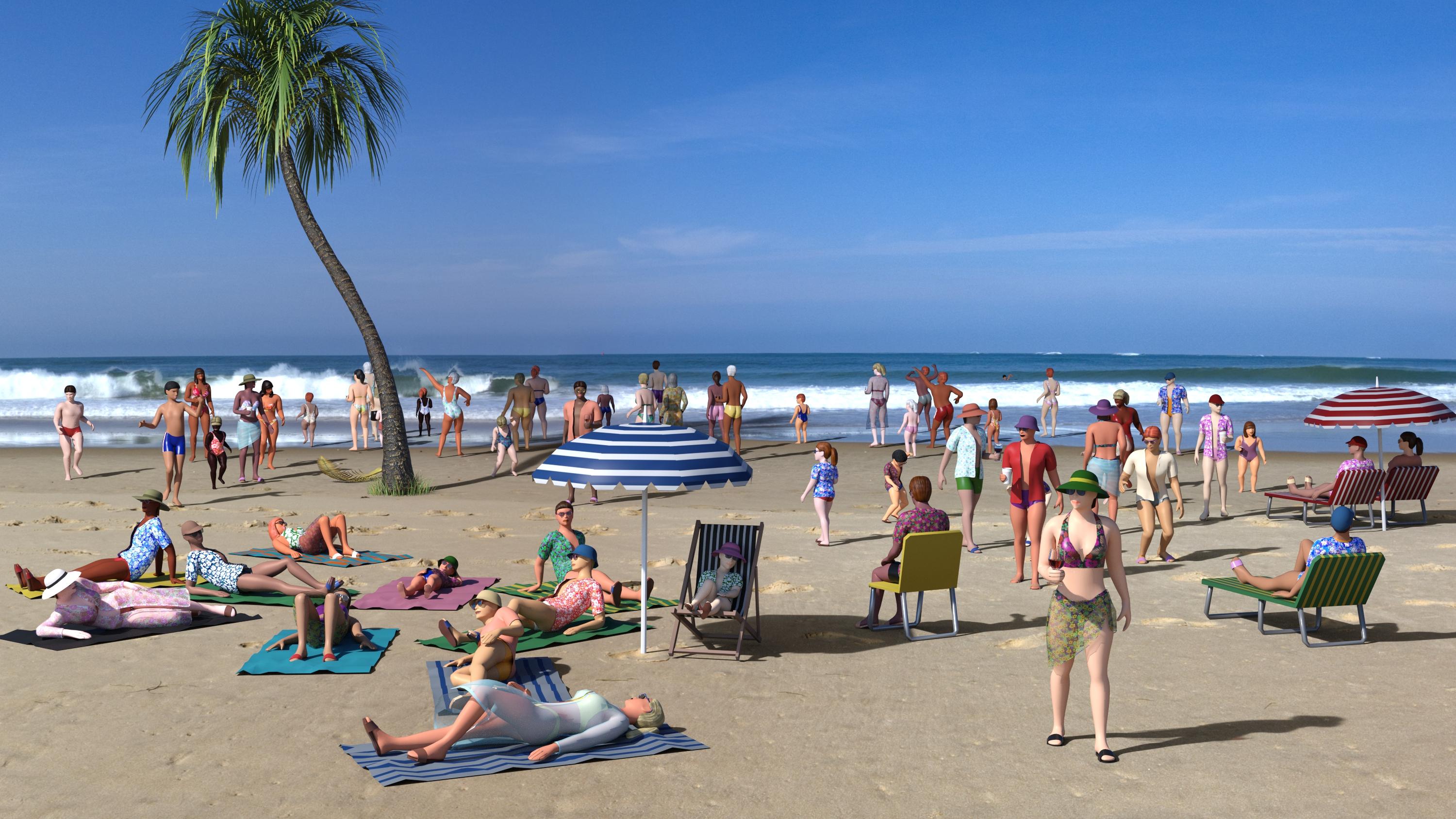 The new LowPi Beach set from PhilW is great fun! It's my favorite add on set. It has a large number of options. PhilW made some great promo images for the set, too. They really give you some ideas of what you can do with it. All of the beach towels, chairs, loungers, umbrellas, clothes, drinks, hats, footwear come with the set. The palm tree, frond, grass and HDRI beach were other things that I added to the scene.