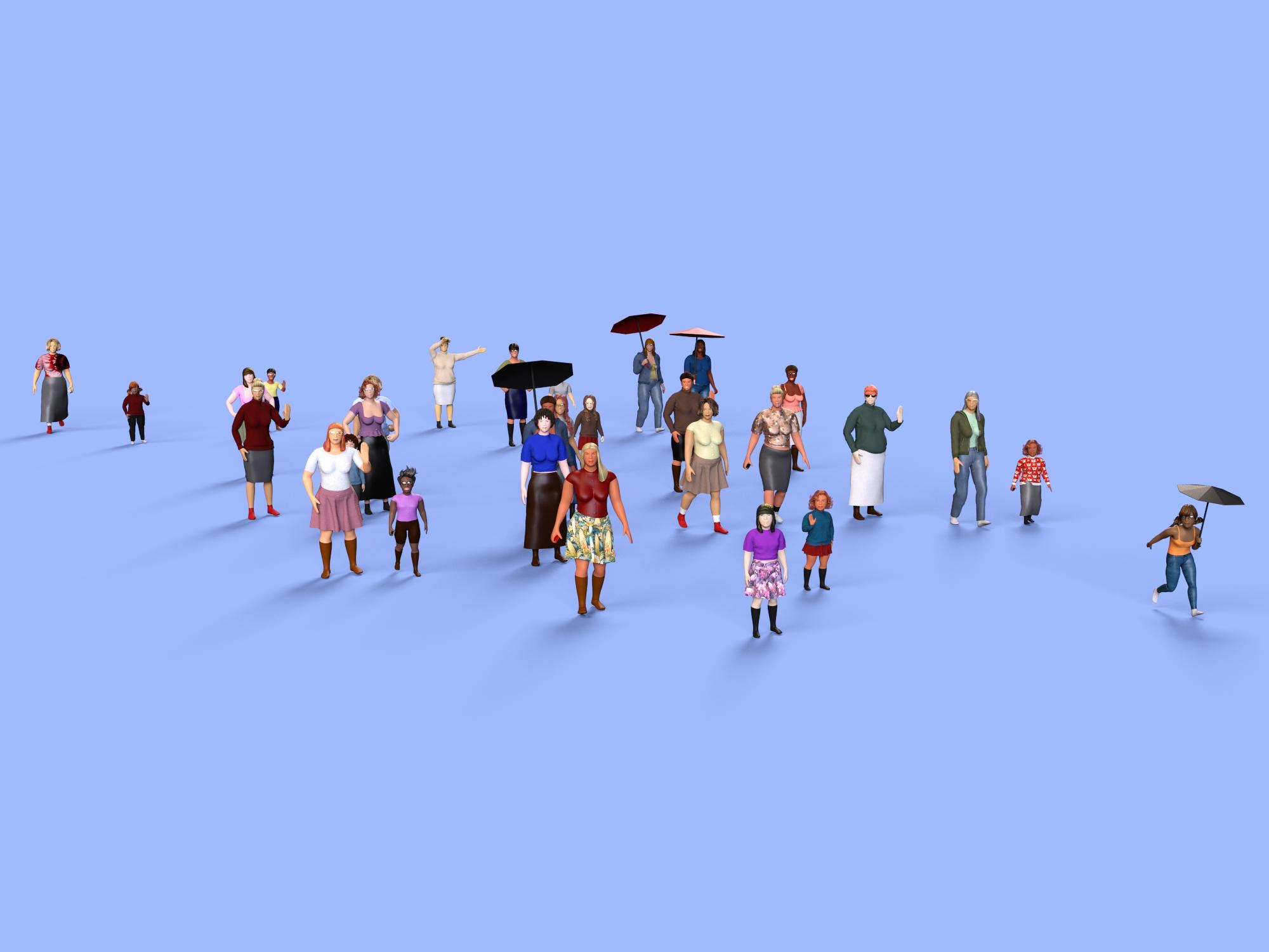 In the second example, I moved the camera and reapplied the Look At Me II Pose Control to all selected LowPi people at once.