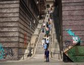 It took me all day to make this picture. Yesterday I made the ascending and descending stair poses. Today I rendered two LowPi crowds with those poses. The, following a previous tip from Totte, I manually selected the LowPi I wanted from the crowds and placed them in position on the stairs. In some cases i changed their clothing or hair or clothing materials. For a few, I added handheld props and applied the appropriate hand/arm/upper body pose. I think there are about 36 LowPi in this scene. I sort of lost count.