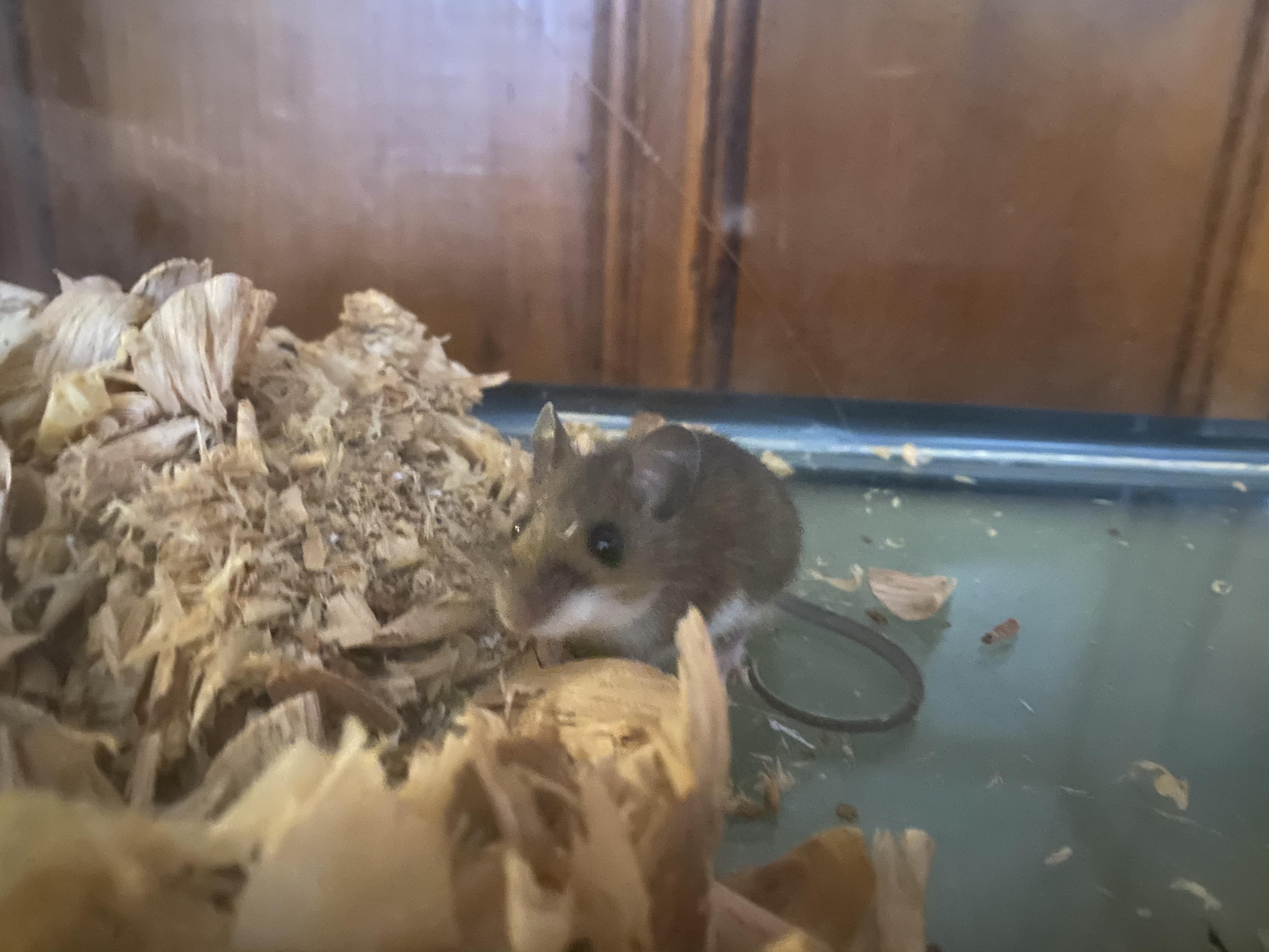 Corky was a Deer Mouse (a kind of arboreal mouse that prefers to live mostly in trees)... Corky woke up early one warm winter day and realized she had no outdoor food to sustain her and decided moving into our house till it got warmer wasn't a bad idea... unfortunately her gnawing the corks off my assorted olive oil bottles was not appreciated and she was promptly apprehended and thrown in rodent jail. The intention was for her to receive a quick (but fair) trial and for to then be exiled to lovely estate/nature reserve too far for her to ride her little bicycle back here.
