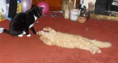 I have had a dear cat called Squeaky. He was 19years 7 months old. We'd had the priveledge of his company from when he was an 8 week old kitten. At 12 weeks, still small enough to to sit on the palm of my hand, he decided that he was brave enough to tackle a Cock Pheasant as supper. Given that he weighed one fifth of the bird, the outcome was predictable, but it showed his courage and determination. He was boss cat in our household, even with much bigger Norwegian Forest Cats and Maine Coon cats in the household. Squeaky was a black & white Heinz57 domestic mog, with a short tail after half had to be amputated.