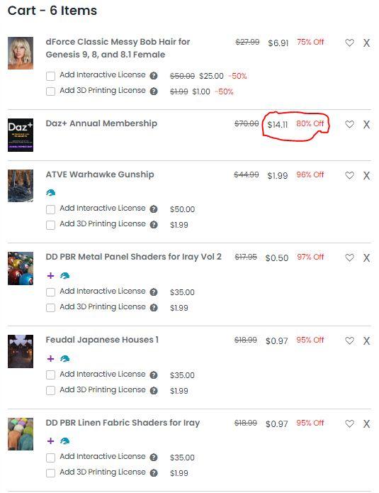 It's the second day of the sales and I don't find them disappointing... Cart has 39 items in it for $71.29 at 91% off with Daz+ Annual membership for $14.11 - If I could just go through with checking out (using store credit) I'd be happy