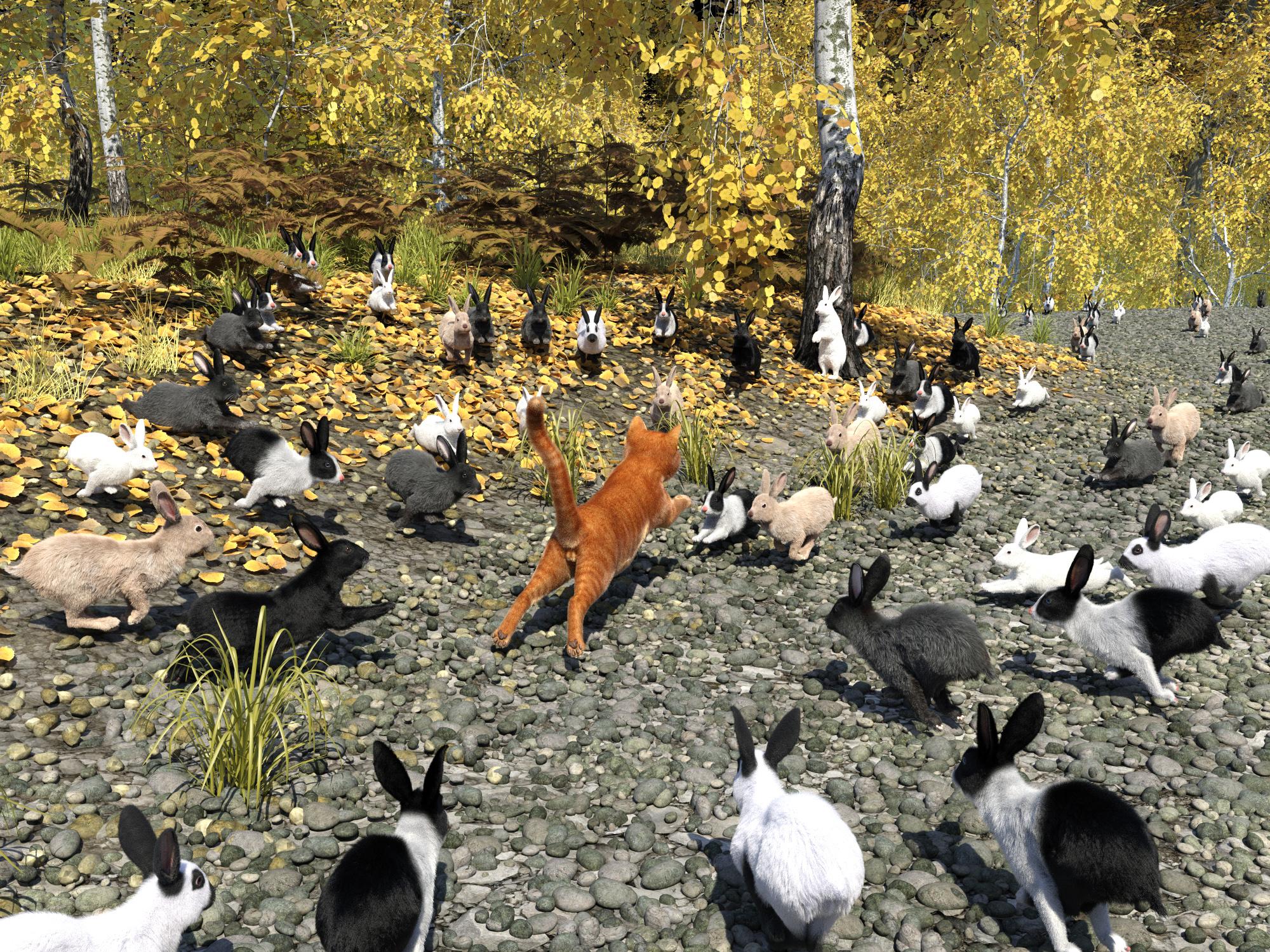 Our Floyd (Maine Coon cat) depopulated a large warren so much that it took 3 years from when he was run over for us to see any rabbits out in daytime again. Now, 10 years on the population has finally recovered and there are always rabbits visible as in Barbult's image. One thing is very wrong, though. Every rabbit is facing the wrong way. Regards, Richard