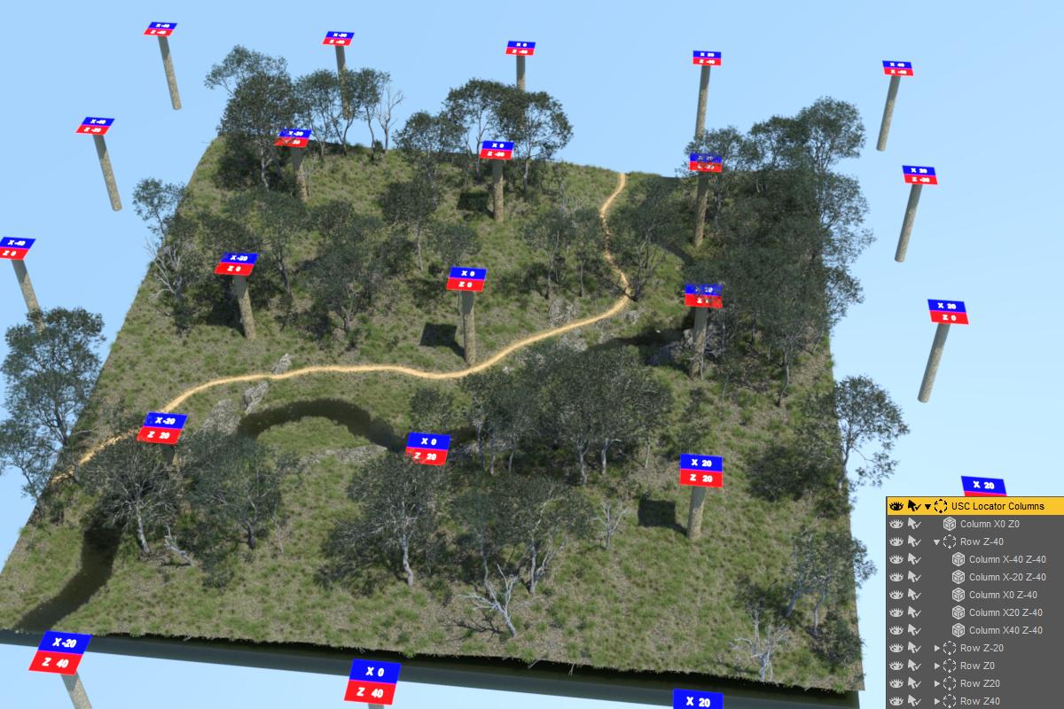 UltraScenery is generally very slow to navigate around because you have nothing to click on so you can focus the camera onto it, and scrolling is slow, especially with the new 256m square USC2 landscapes. This little prop sets up an array of columns at 20m intervals over your UltraScenery scene. You can then click on an appropriate column, press "<Ctrl/cmd>F" and then you zoom rapidly to that spot.