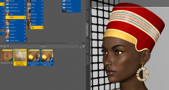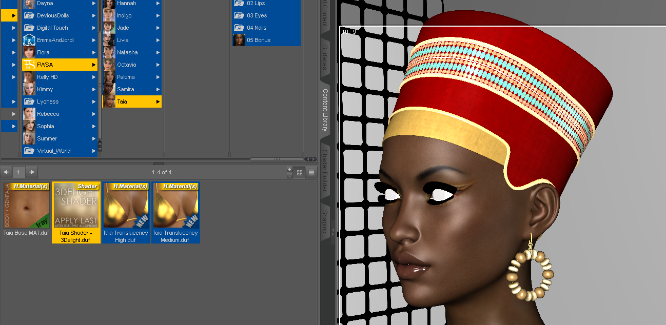 Samira is very dark rendered in low-mid lights, if you look at the popups for the Egyptian outfit you can see her applied to Josie in my standard 3 spot light setup.  The lights in the bundle do a good job of making her look beautiful, but she is a bit tricky to light.