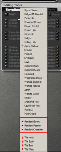 Go back to the terrain editor (TE) and switch off Random Extent, Random Position and Random Character. If you hold down the Shift key while clicking on any one, all 3 get deselected. Now enable Tile North and click on Fractal. This creates a new terrain from the same random seed that tiles neatly north of the previous one. Exit the TE.