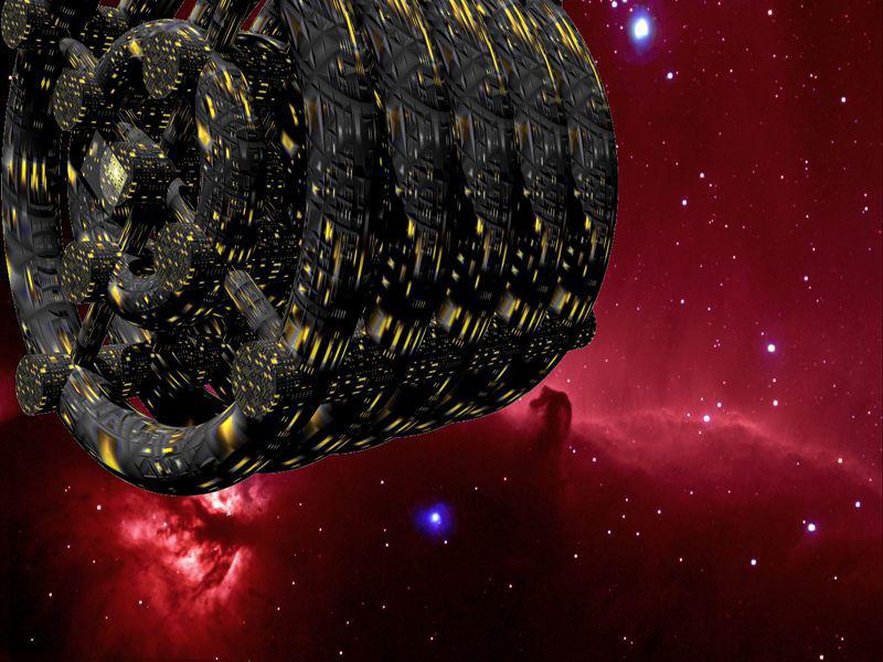 The habitat was made in Bryce with cylinders and cubes, the backdrop is a photograph from the Horace Head Nebula. This is my 66th render made with Bryce 5.01 in 2003.