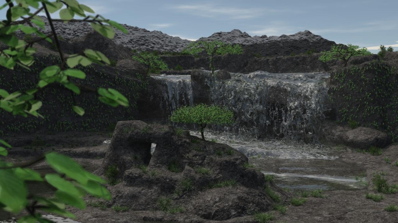 Carrara shaders are provided for the alternate rock and grass textures, although you do have to apply them yourself. The waterfall itself comes as a separate prop, purely due to its size.