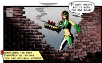 I had a bit of fun with this one. I also did the rendering in Poser 11 using their Comic Book Preview. This is a different process, as the render is pure b&w, so all the coloring was done by hand. I also used a different line-shading technique for the shadows. The character is the Gama Girl cartoon figure. You can also see that I'm bringing back the grainy background and rough lines that I started using in the other illustrations in this series.