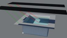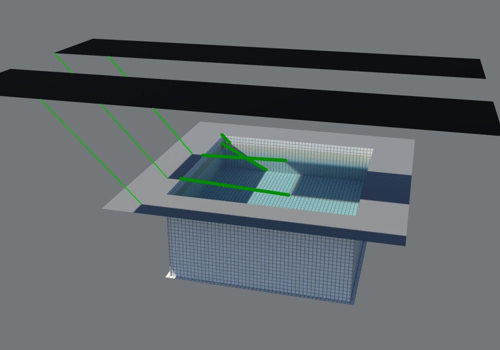 In the attached pictures you see on top an overview of the set. The pool is 4 by 4 meters, 2 meters deep and round 3 eters above it I placed two slim planes (sh1 and sh2) producing well defined shadow zones.