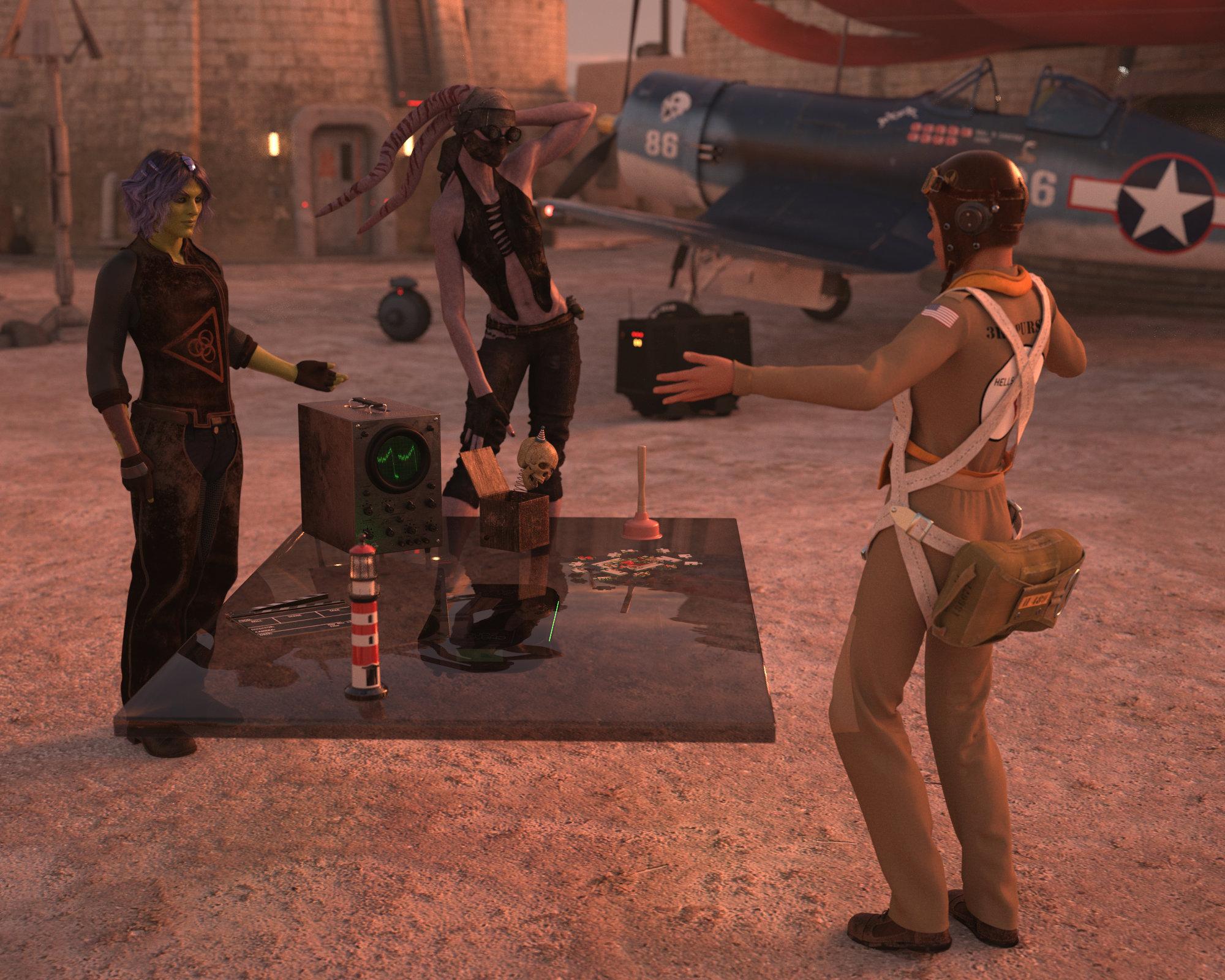 Marine Pilot, Major Jessica B. Caldwell, was flying a routine patrol mission over Iwo Jima in late April, 1945, when a weird lightning storm hit her plane and when she looked down, the world looked very different. She successfully landed, and when she exited the plane outside some weird aerodrome, two strange looking figures appeared with a floating table with stuff on it. One of the said: – "Welcome to our universe. We asked for help from the ancients, and they sent us these items, and you. Solve the riddle, and we can bring down the evil empire."
