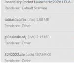 When you look at the IRL Daz shot, the incendairy rocket launcher (IRL) peices are Separated or Not Together. It needs to be joined together with the rocket which has fins as a separate entity. See attachment.