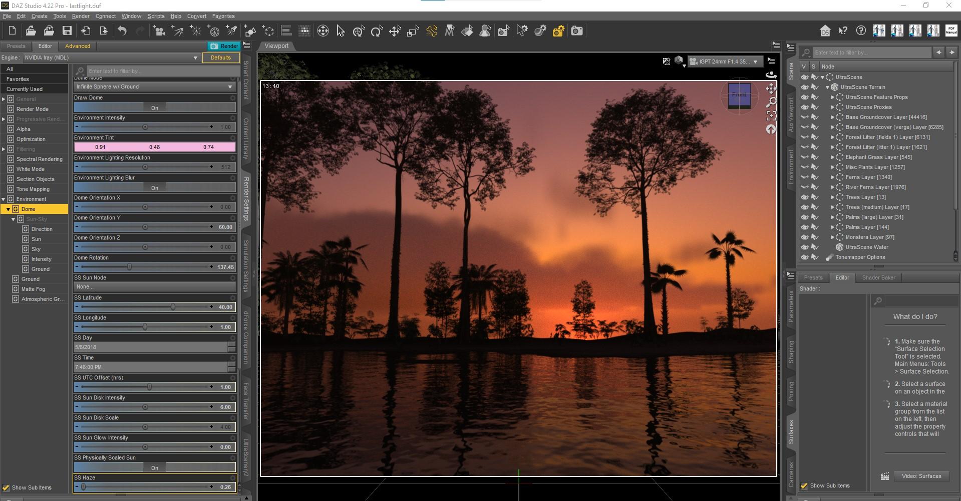 Here's something that's important to mention. If you're using the original Ultrascenery - as is the case with the sunset image, which I created a couple of years ago - do not just switch to NVIDIA Iray view without preparing the scene items. I'm running a decent system - an RTX 3090 - and it will stagger to a standstill if I do that.