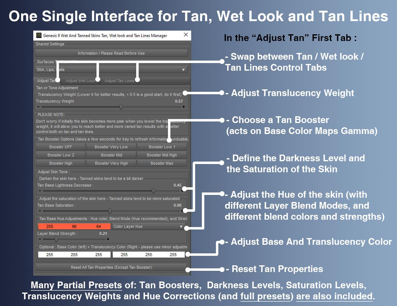 - Tans and skin tones sub-tools include lightness, saturation and hue controls associated with tan boosters (Base and Volume) and translucency weights tools. They also include a huge amount of full presets to cover a wide range of initial figures, lighting, and desired tan.