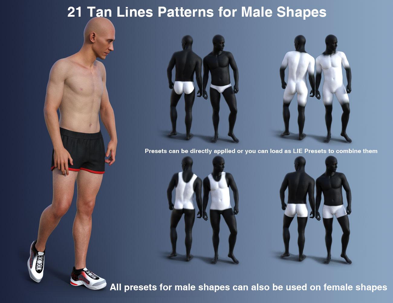 - Many tan lines patterns are provided, both male based and female based even if you can apply female patterns to male and inversely, and once they are applied, you can adjust the tan lines saturation, lightness and hue.