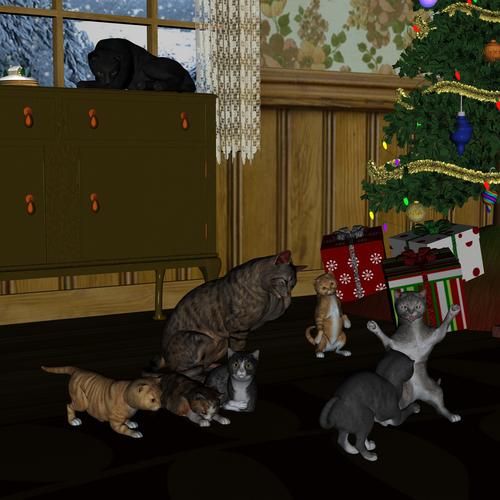 So anyhow here's a render useing Diao's kitten morph and some of my poses ,forgive the X-mas stuff this is the only room interior I had already set up .But I like it .