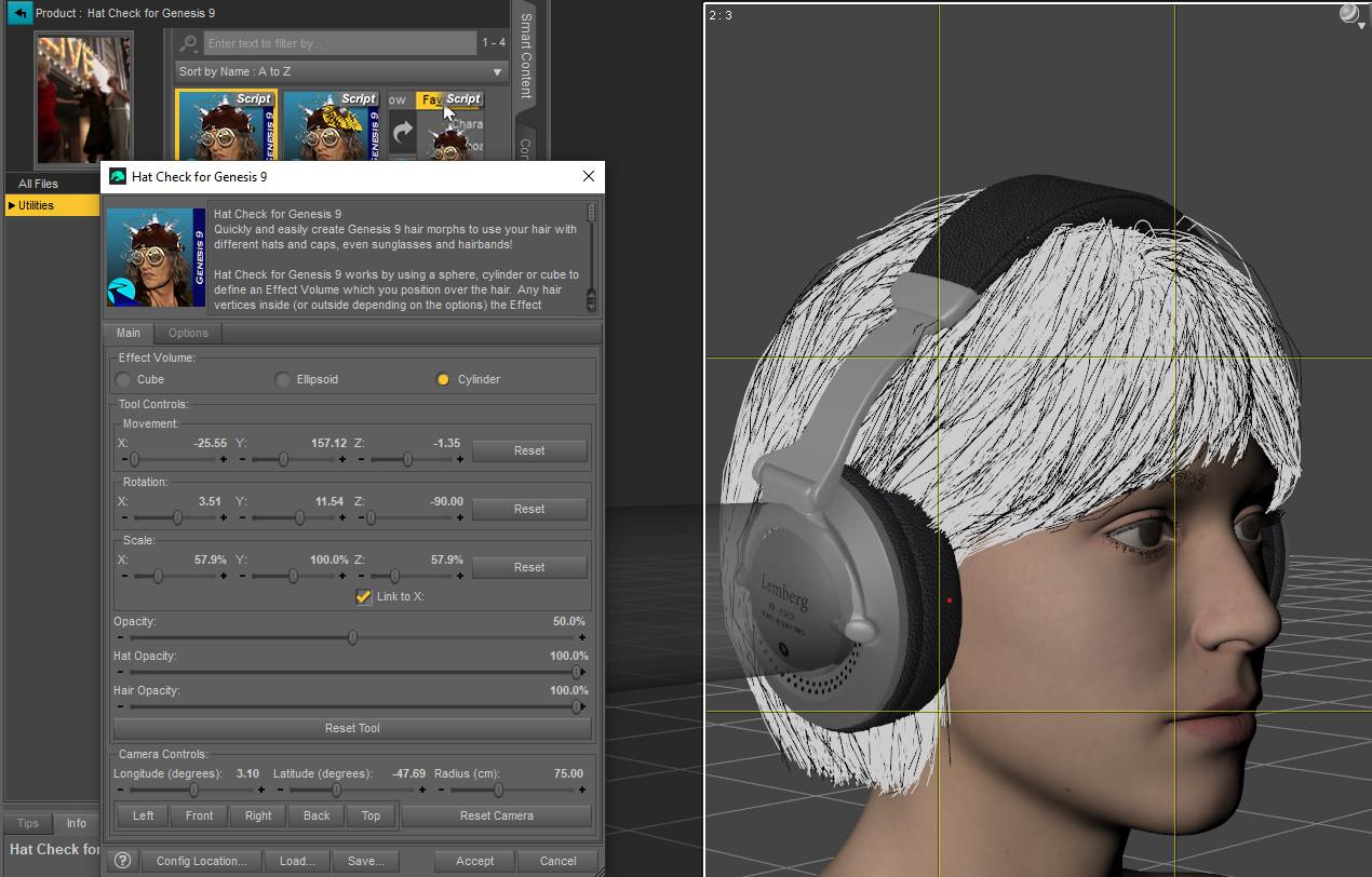 I don't know if I did something wrond while using it with Daz Studio 4.24 on Windows, and I'm not completely sure what cause the problem, but when I tried to use Hat Check with a cylinder (to create morphs for a headset) I encountered a strange behaviour.