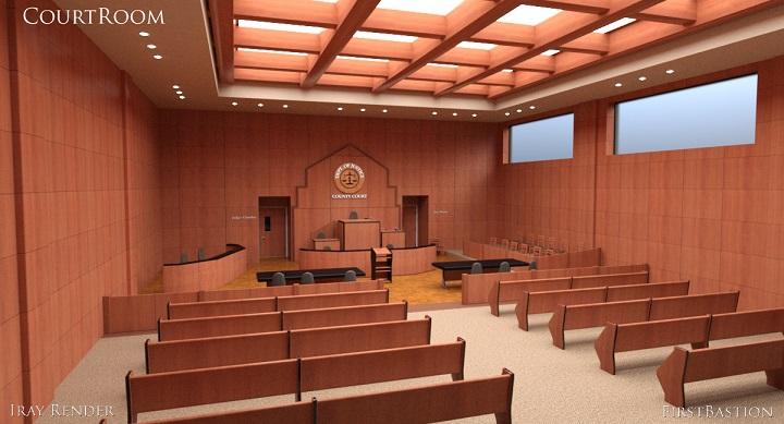 • If I'm remembering,  the few courtrooms I attended were full interior rooms with no windows at all. Generally painted plain biege.  Really boring.   There would be windows in the hallway leading to the 5-6 courtrooms aligned next to each other.  But I'm always thinking how to cast some light into the interior so the windows made sense for this.