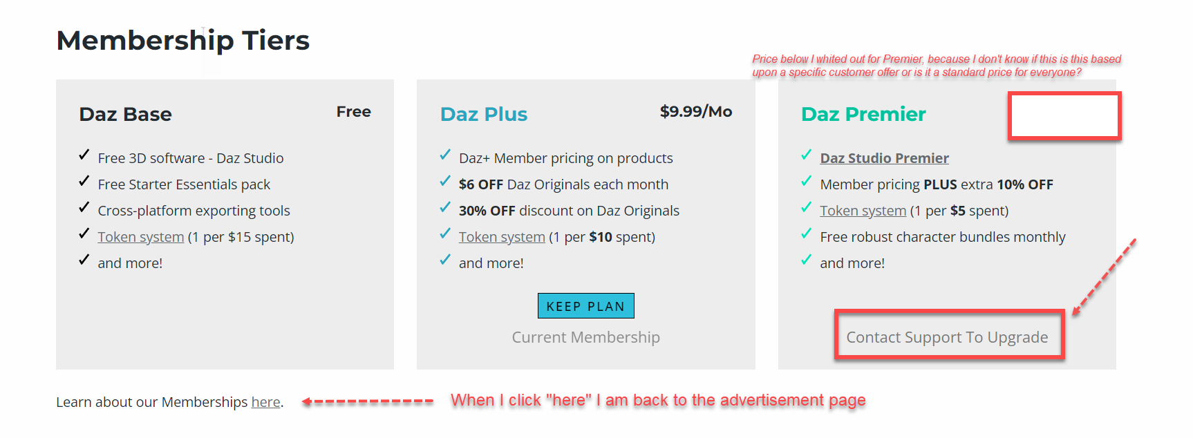 it seems to me if you have already purchased a year or two, whatever, of DAZ+, the price of Pemium should be 18.99 minus the monthly worth of your existing DAZ+ contract, at the very least. I have an offer for one month of Premiere free, but it actually isn;t free as I have 2 onths to go on my current DAZ+, so the second month I lose $12? current annual is 70 so that about $5 something a month. Also, there is no way I will pay $10 a month for plus when I've been waiting for Plus discounting to renew, not nearly double.