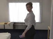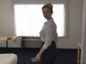 young woman with blonde hair wearing a toga (flirty smile) standing in parking lot at night