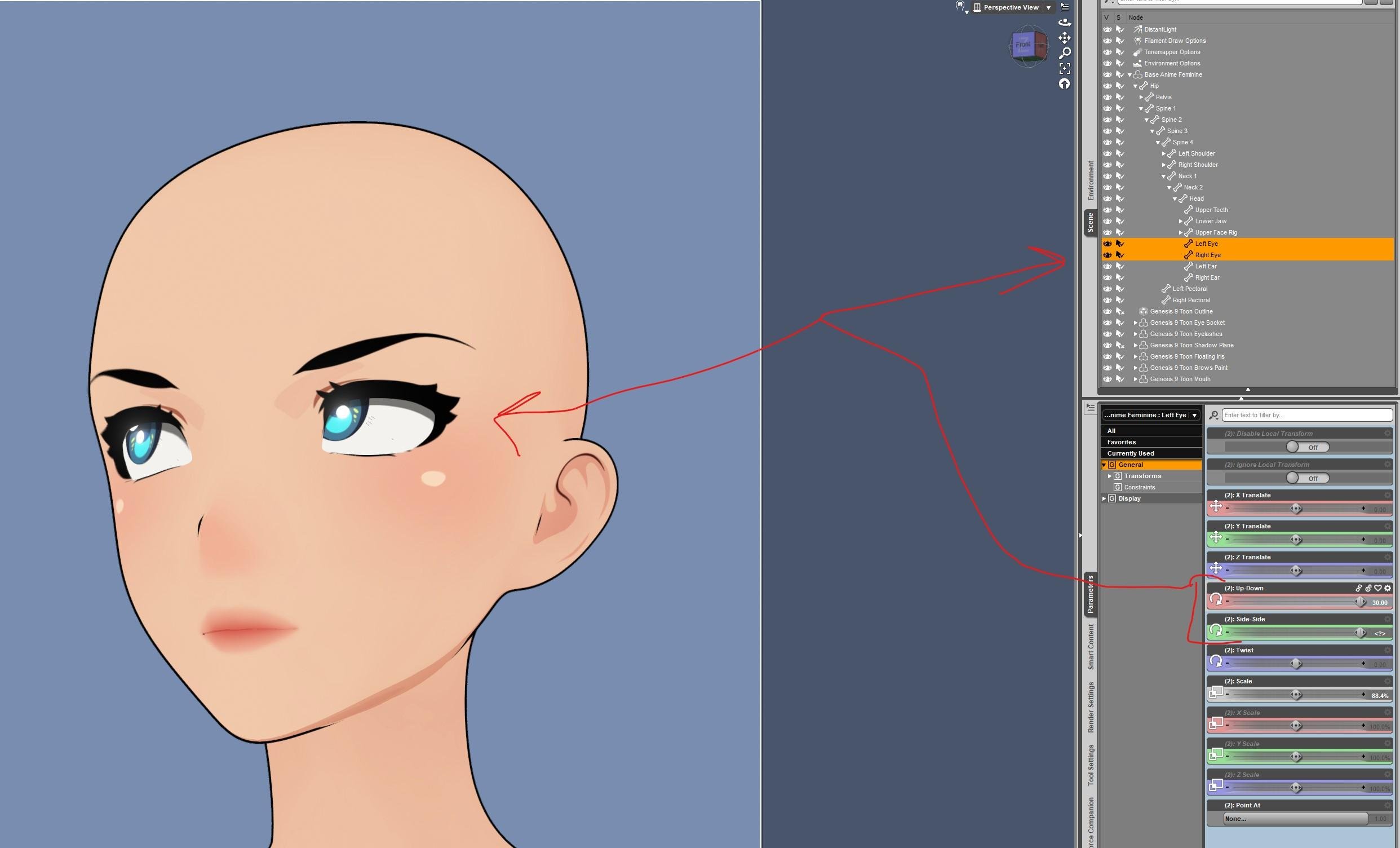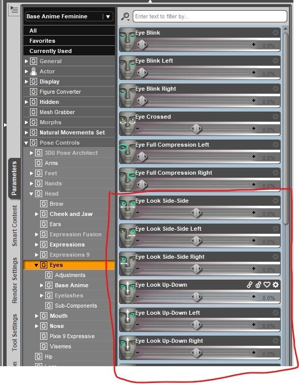 You can select the Left Eye and or Right Eye in the character itself under the Head bone, and adjust the Up-Down and Side-Side. You can also use the Pose Controls. There is no magic.