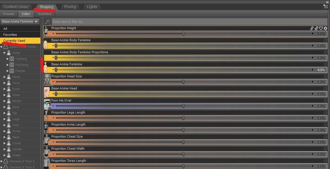 The anime figures are built on the standard G9 figure. If you load the feminine anime figure you can find the dials on the shaping tab under currently selected. Drag the Base Anime Feminine Dial to 0%