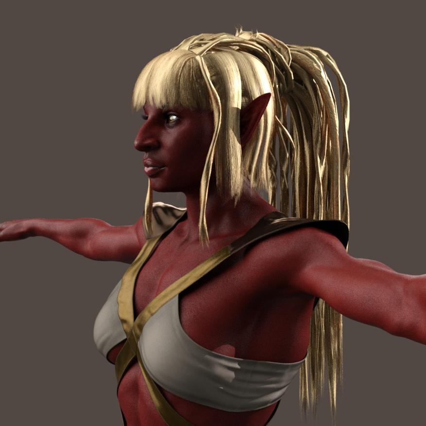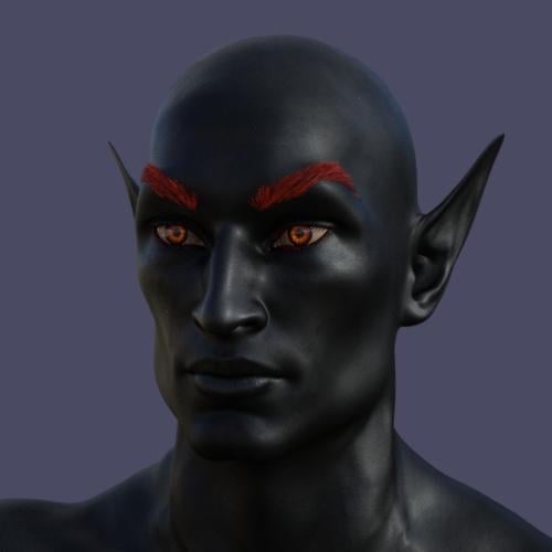 I started with Genesis 8 Male with the base skin of the Aran Demon.  With skin this dark, it's important to bring in lots of gloss so the face can be seen, especially in lower lighting.  I did modify the original Aran gloss settings, using the Dual Lobe Specular surfaces.  I morphed the chiseled features and gave him red lashes and fibermesh brows.  The pointed ears are tall so that they would poke through the hair, though they can't be seen in the final pose.