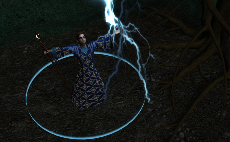 Okay this is a rough draft. 3Delight - Uber environment with sky 8. I darkened the Uber environment lights quite a bit to make it nightime using darker grey and blue greys. I have point lights on the top of the staff and along the lightning bolt. It needs..... something more. Or less lol. Not sure where to go with this, I would kind of like to make the circle glow a bit more but have no idea how to make that happen. I feel like the edges need to be darker.