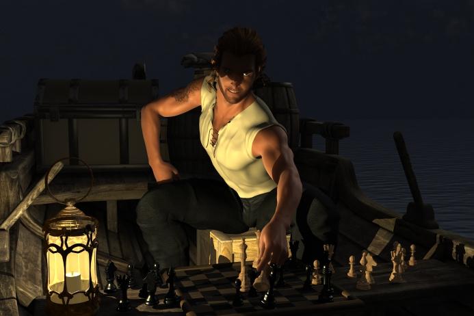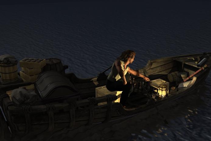 I tried repositioning the lamp. In a test render I raised the lamp and that got rid of my problem, but we can't have a floating lamp, now can we? It also cast light on the water making it light up in an unnatural way. So I tried to scoot the lamp around on the bench. The first pic shows that funny attempt. Makes him look pretty sinister.