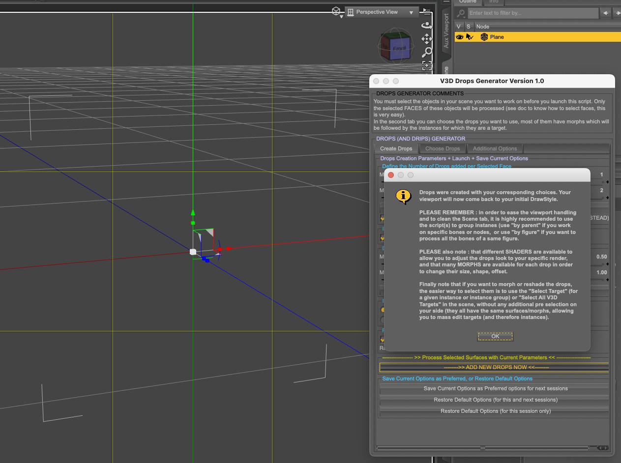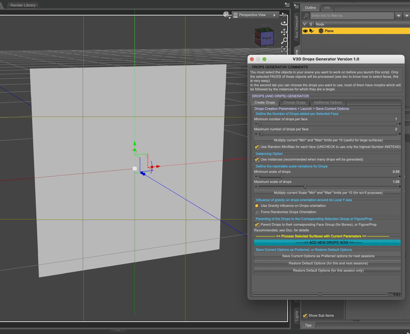 After selecting the kind of drops I wanted, their numbers, scales and so on, I ask the script to add them. It changed the viewport 'render' mode and finished in an instant (no progress bar) before telling me than the drops were created. Except they were not.