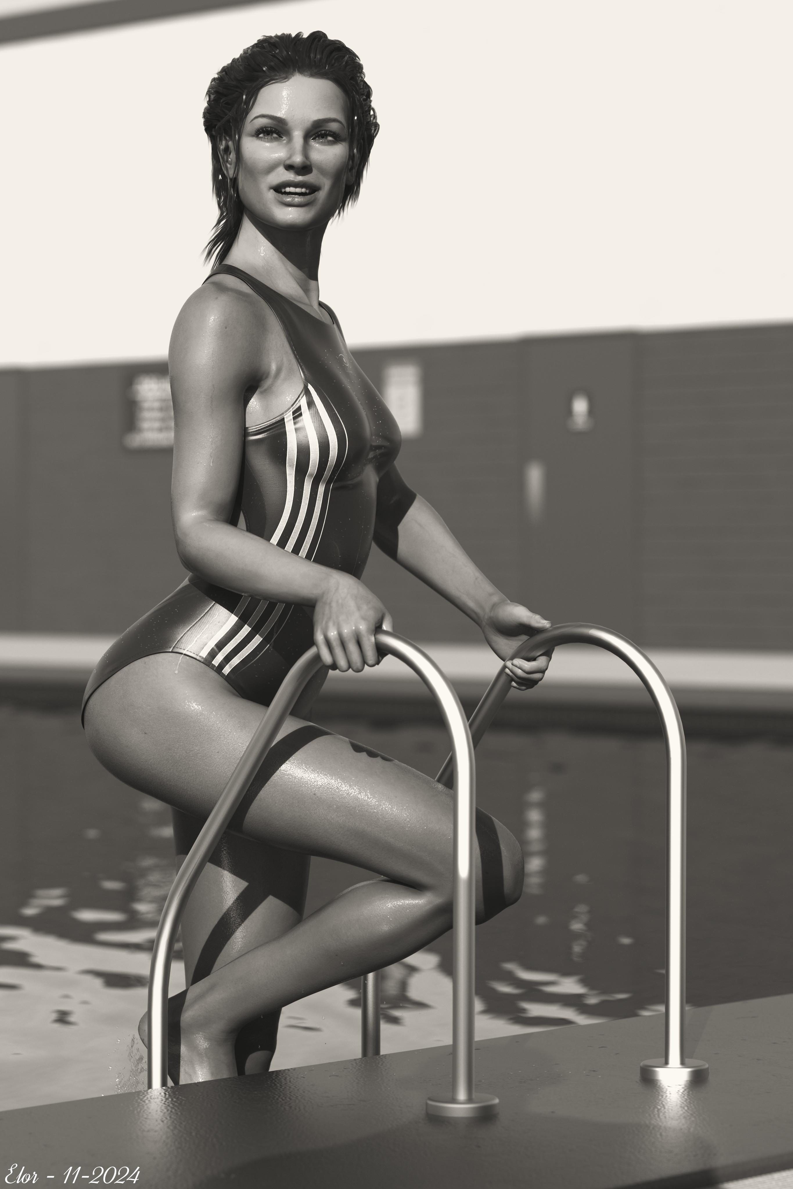 At one point, I used the 'Water - Dispersive' shader included in Daz Studio, which made them more visible, but I ended using your 'V3DsG Shader S Fresnel' and it gave they a more subtle looks (which felt more right in the end). In this render, they are a couple of drops falling from her right leg, on a primitive plane rotated to follow the orientation of her legs (I thought about adding more but I'm still trying to get the hang of the scale of the drops and spent some time posing the couple of drips I added on Jacqueline or her swimsuit):
