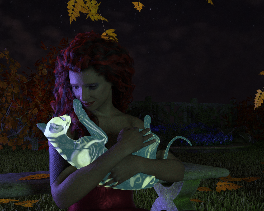 The female character is actually Phx Liam; I dialed out G9 base masculine and dialed in G9 feminine instead, but otherwise left the character's morphs alone. Eyemakeup and lipstick are from various makeup lie packs, but the bruises and the rest of the character mats all come witht he character. To make the ghost cat, I played with the emmision's channel (obviously), and I dialed the cat's overall opacity down to 50%.