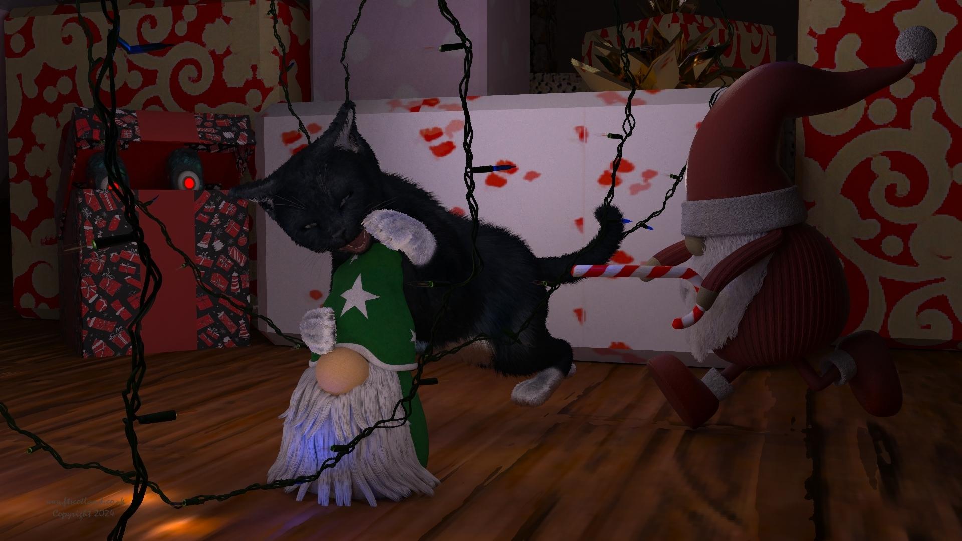 In the quiet of an early Christmas morning, almost nothing is stirring. That is, until a very mischievous kitten decides to take the new floor cleaner for a ride. Little did he know that his joyride would awaken a mysterious visitor lurking unsuspectingly in one of the gifts.