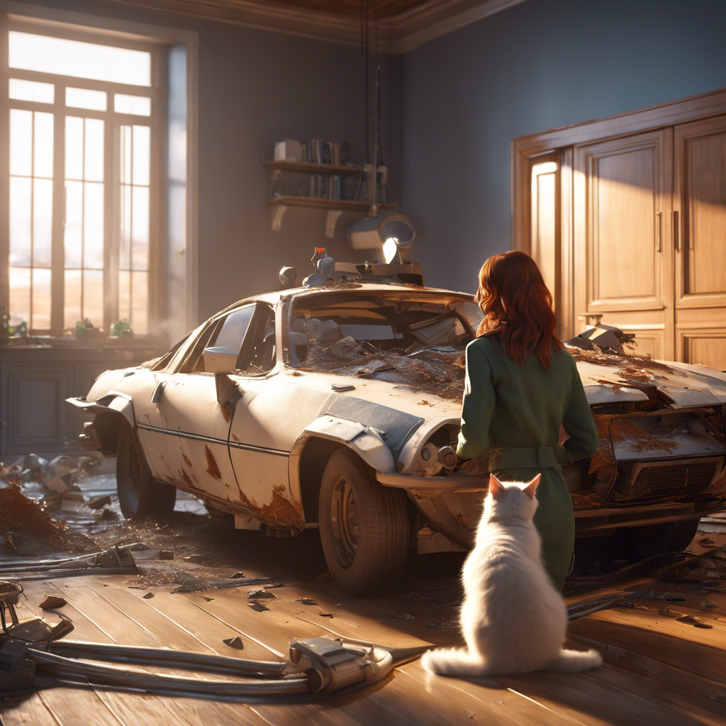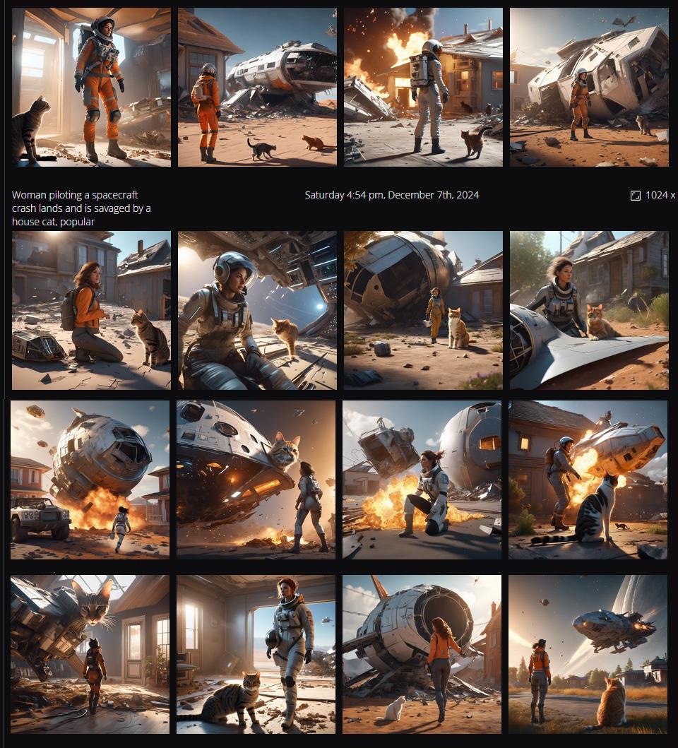 Prompt: "Woman piloting a spacecraft crash lands and is savaged by a house cat."