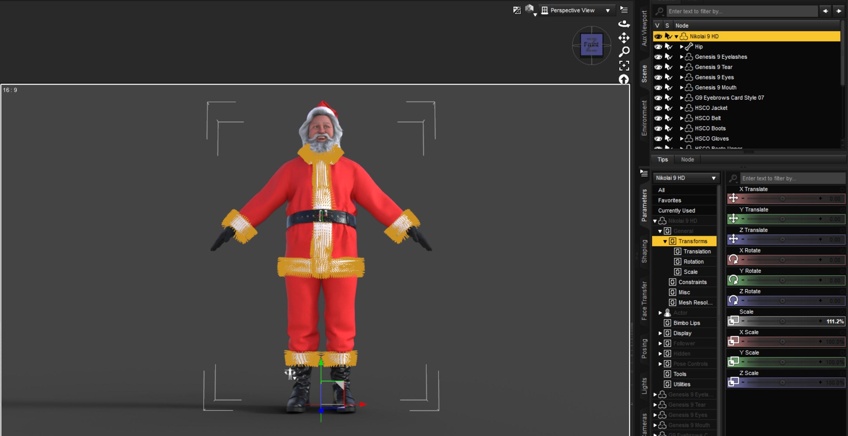 I applied the clothing one by one https://www.daz3d.com/dforce-hnc24-santa-costume-outfits-for-genesis-9 to the character, some of the elements were floating