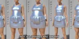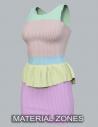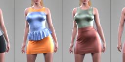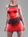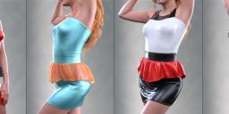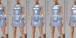 This dress comes in silk, knitted, leather, and nylon lace fabric types. All fabrics have nine plain "Any Color" materials and nylon lace has five patterns. There are also hide/unhide options for five material zones, and dforce simulation presets to turn simulation off and on for skirt or peplum and restore fabric simulation settings for all dress parts.