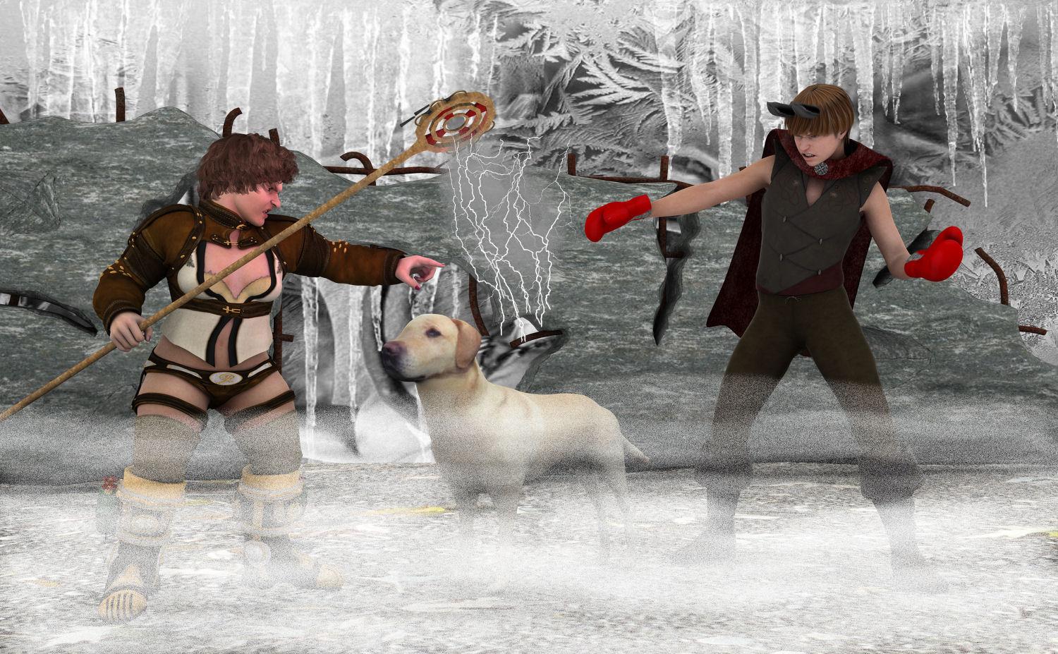 The dwarf witch Selena started battling The Devil Boy Daemon over their dog Satan. She was so mad she froze hell over with her magical staff. The devil boy tryed to knock the witch out but she was too powerful for him once she froze hell over.