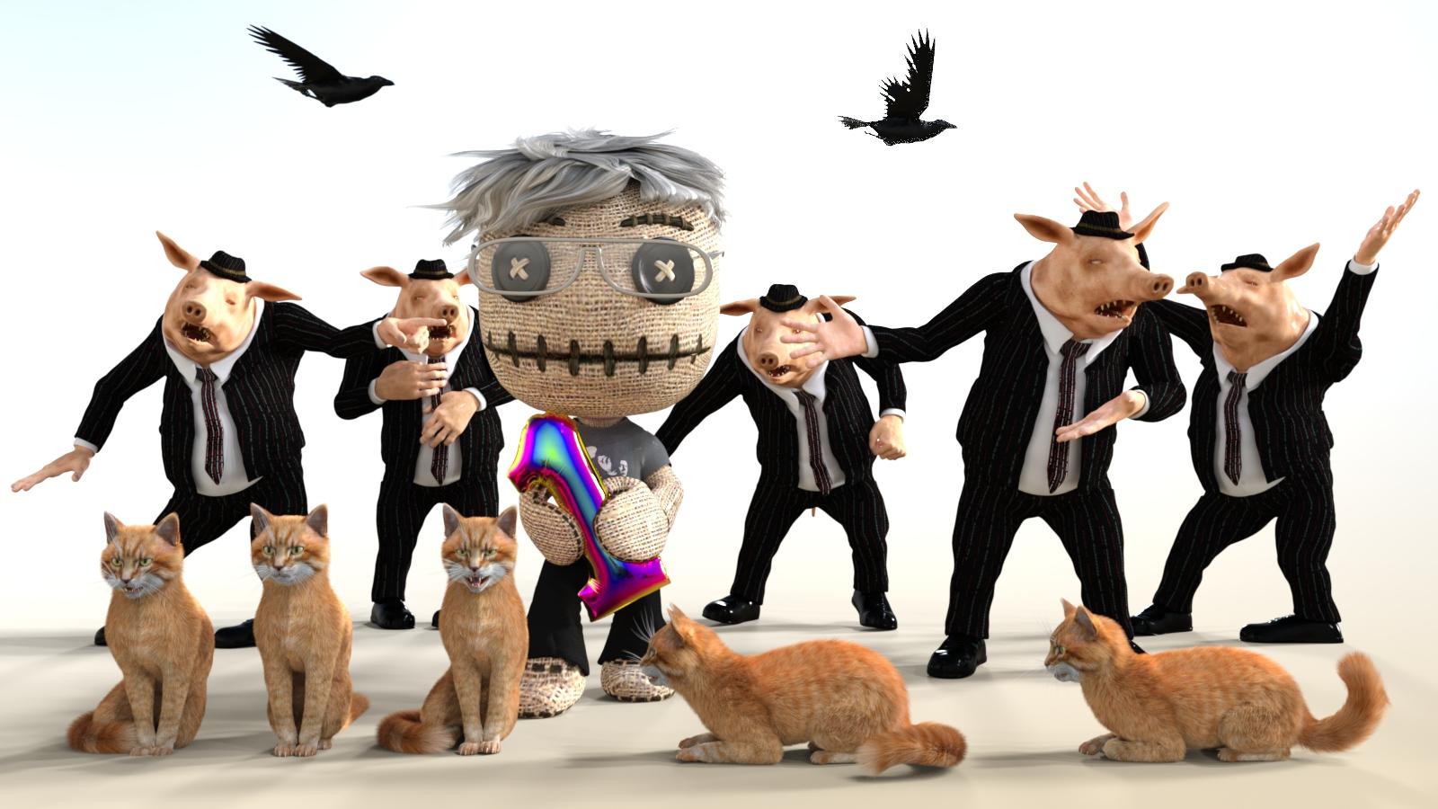 If it helps: the ONE and only Sackboy, holding a figure ONE balloon ...