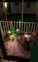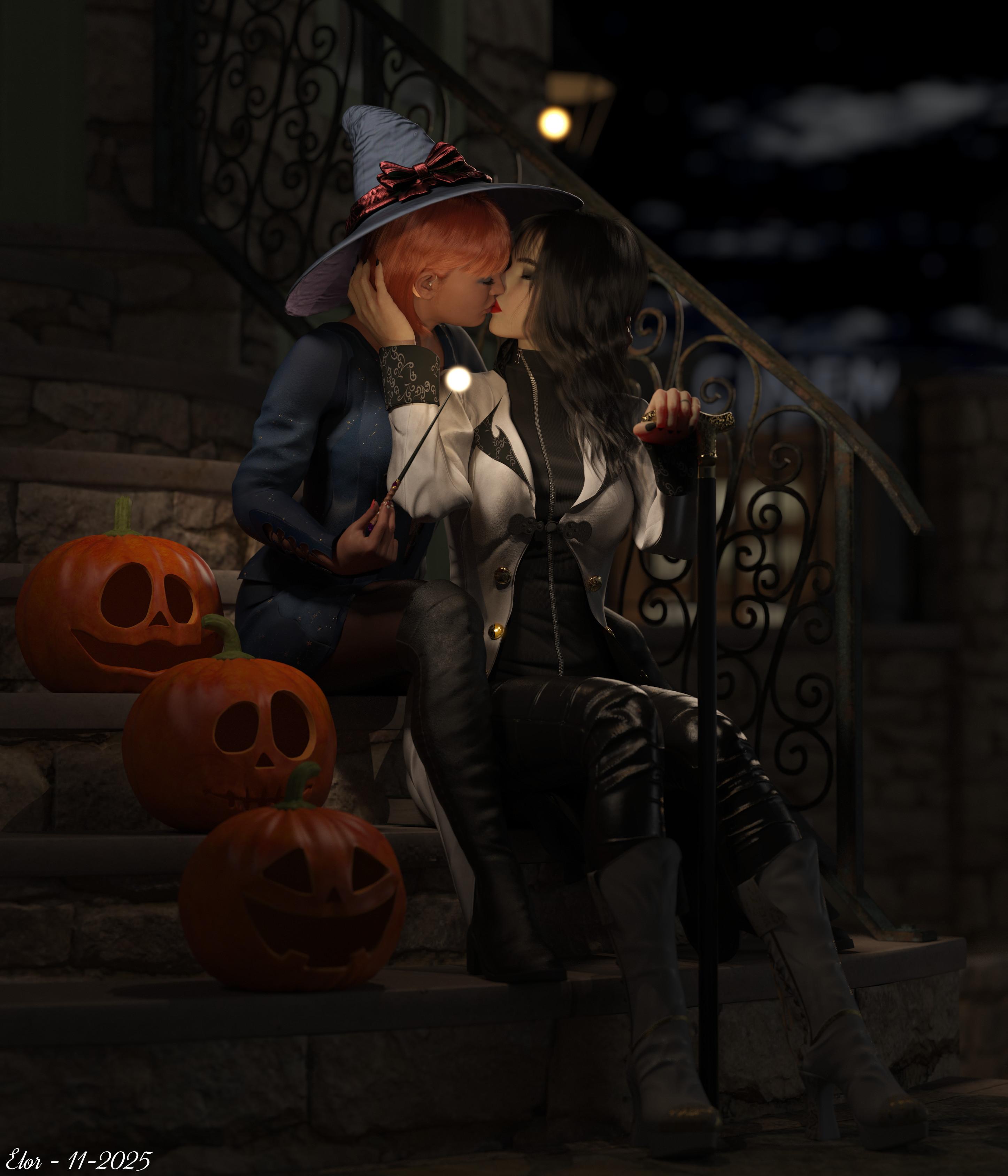 Victoria and Lacey waited for their friends before going to a Halloween party, sitting on the stairs, chatting and kissing.