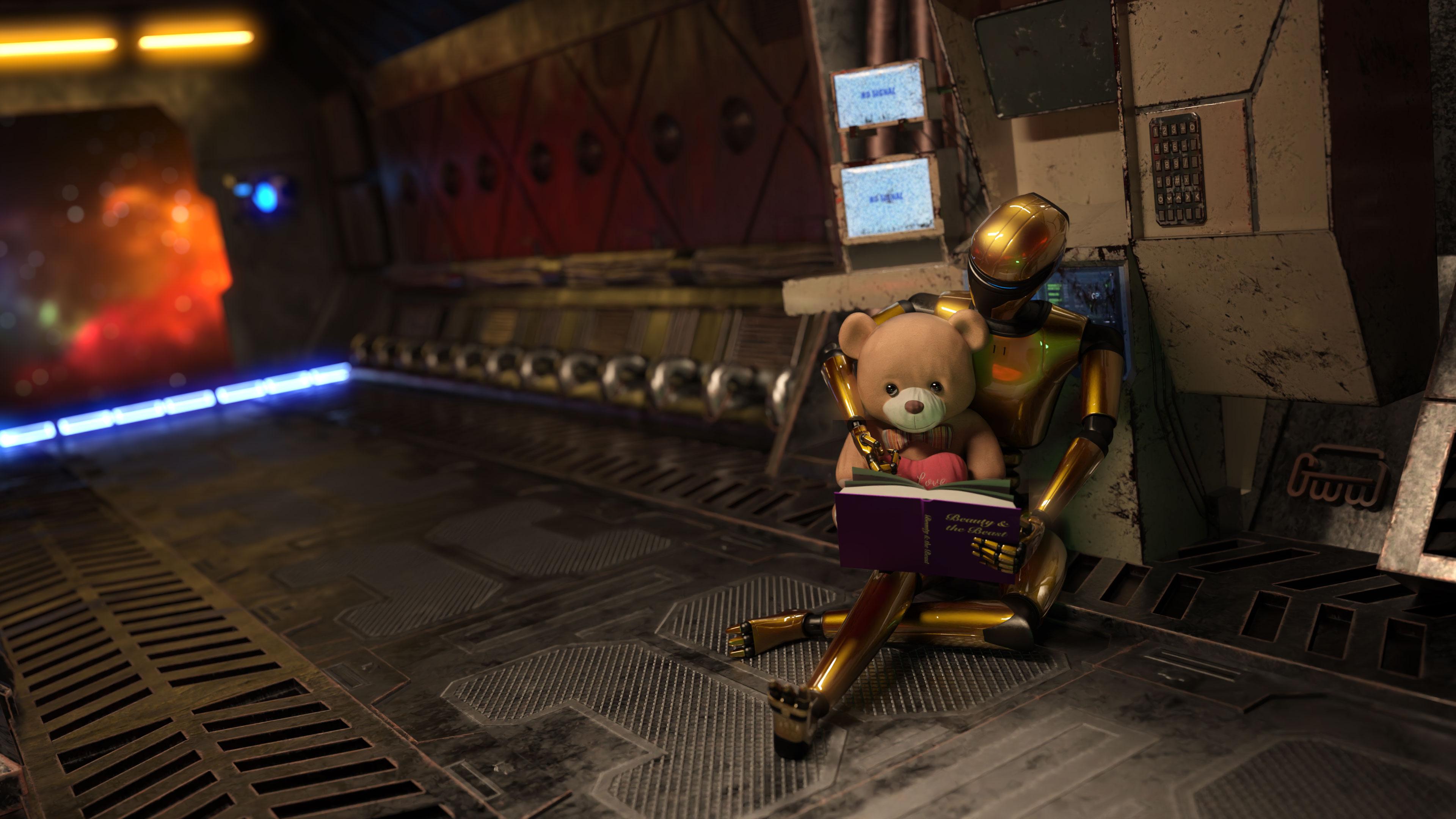Covering both the hardness of the metal robot vs the softness of the teddy bear (Jan) and also the coldness of space vs the warmth of friendship.